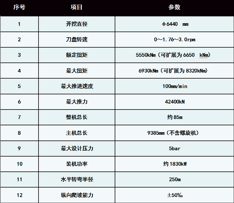 6420mm土壓平衡式盾構(gòu)機(jī),適用于復(fù)合地層、泥巖、砂巖、砂卵石及軟土等地質(zhì)情況,其主要參數(shù)如下: