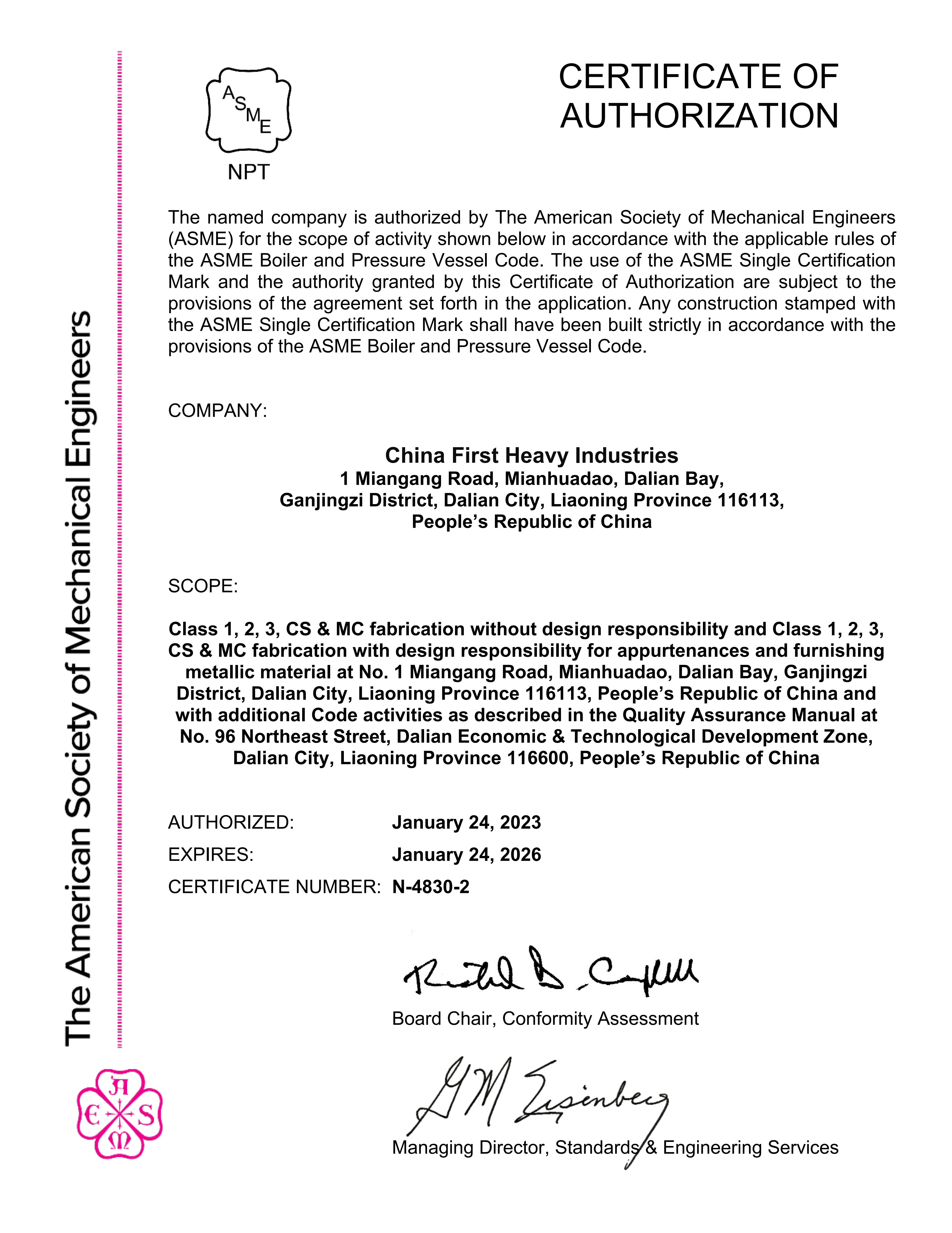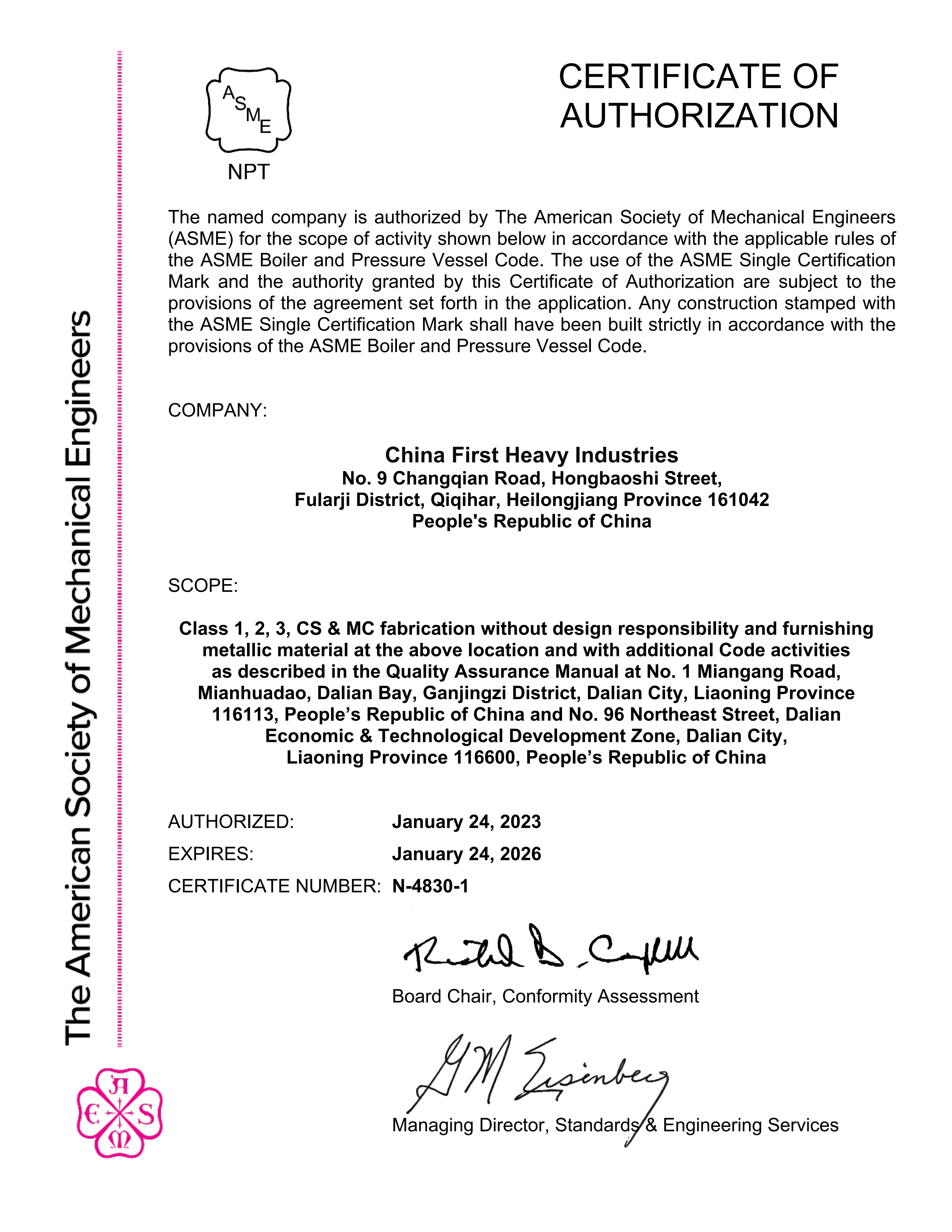 【簡介】該證書是ASME NPT授權(quán) 證書,由美國機(jī)械工程師學(xué)會(ASME)授權(quán),公司自2008年1月獲得ASME核設(shè)備制造證書,依據(jù)ASME NQA-1 和ASME第三卷NCA分卷建立了ASME核電產(chǎn)品制造質(zhì)量保證體系。證書范圍是無設(shè)計(jì)責(zé)任的核1、2、3、CS和MC級部件制造和有設(shè)計(jì)責(zé)任的附件制造,以及作為供應(yīng)鐵基和非鐵基材料的供貨組織,該證書換證周期為3年,授權(quán)我公司可以按ASME標(biāo)準(zhǔn)和質(zhì)量體系的要求在上述范圍內(nèi)制造核電產(chǎn)品零部件和提供材料。自取得制