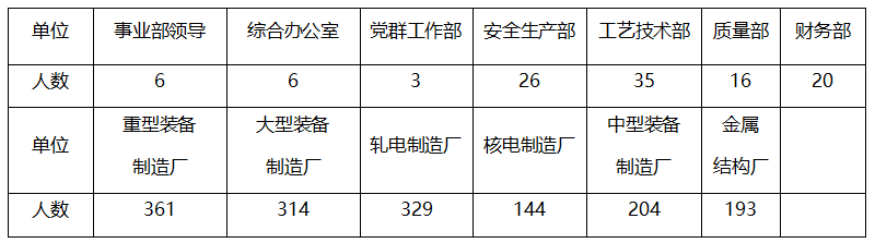 事業(yè)部下設重型裝備制造廠、大型裝備制造廠、軋電制造廠、中型裝備制造廠、金屬結構廠、核電制造廠等6個生產及輔助單位和黨群工作部、綜合辦公室、安全生產部、工藝技術部、財務部、質量部等6個職能部門。截至目前,擁有在崗員工1657人。
