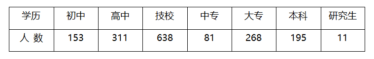 4.從學歷劃分,初中學歷153人,占9.2%;高中學歷331人,占18.8%;技校學歷638人,占38.5%;中專學歷81人,占4.9%;大專學歷268人,占16.2%;大學學歷195人,占11.8%;研究生學歷11人,占0.7%。
