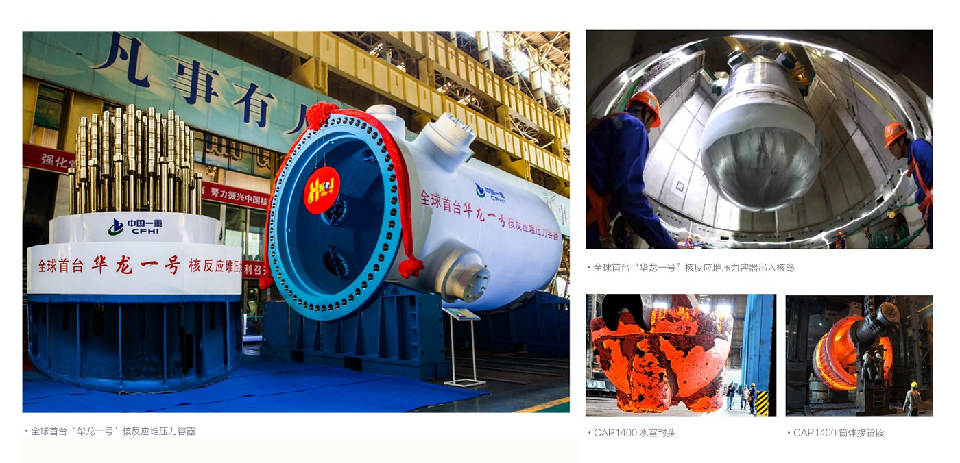 中國一重是國內(nèi)最早開發(fā)生產(chǎn)核能設(shè)備的企業(yè),也是國內(nèi)最大的核電鍛件供應商,中國一重大力推進核壓力容器、蒸發(fā)器、穩(wěn)壓器、堆內(nèi)構(gòu)件、主管道等產(chǎn)品的技術(shù)和市場開發(fā),已具備核島一回路核電設(shè)備的全覆蓋,成為全球少數(shù)兼?zhèn)浜藣u鑄鍛件和核島成套設(shè)備制造能力的重要供應商,國際先進核島設(shè)備供應商和服務(wù)商。是國內(nèi)唯一承擔并已完成二代、二代加、三代、四代核電技術(shù)裝備制造的企業(yè),具備年產(chǎn)5臺套核島一回路主設(shè)備和5套常規(guī)島轉(zhuǎn)子鍛件及汽輪機缸體鑄件的生產(chǎn)能力。目前在建核電站80%以上的核電鍛件、70%以上的核反應堆壓力容器均由中國一重生產(chǎn),有力地推動了國家核電產(chǎn)業(yè)的安全高效發(fā)展,是國家核電“走出去”發(fā)展戰(zhàn)略的重要支撐力量。