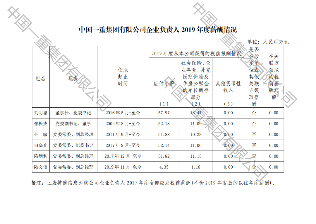 [薪酬公示]中國一重集團(tuán)有限公司企業(yè)負(fù)責(zé)人2019年度薪酬情況