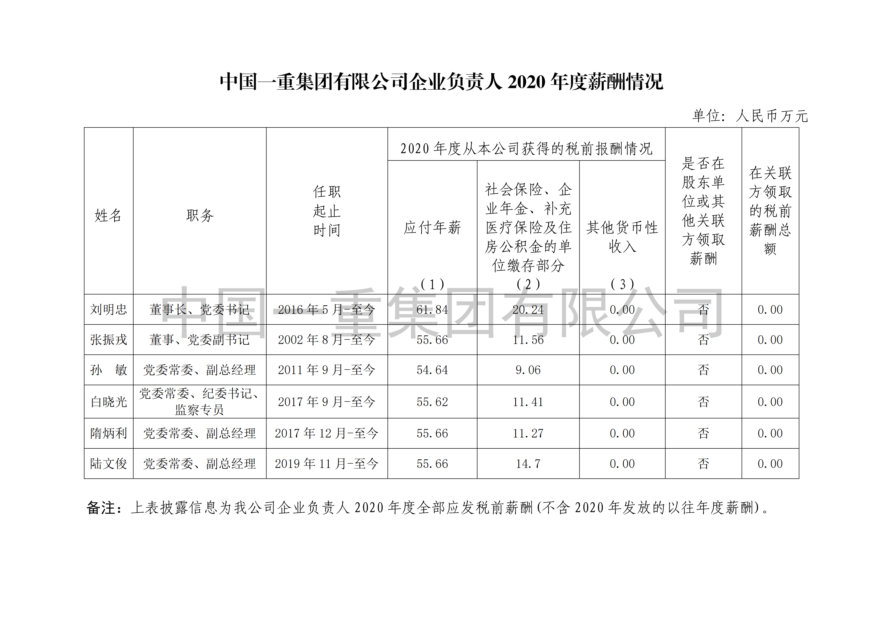 [薪酬公示]中國一重集團有限公司企業(yè)負責(zé)人2020年度薪酬情況