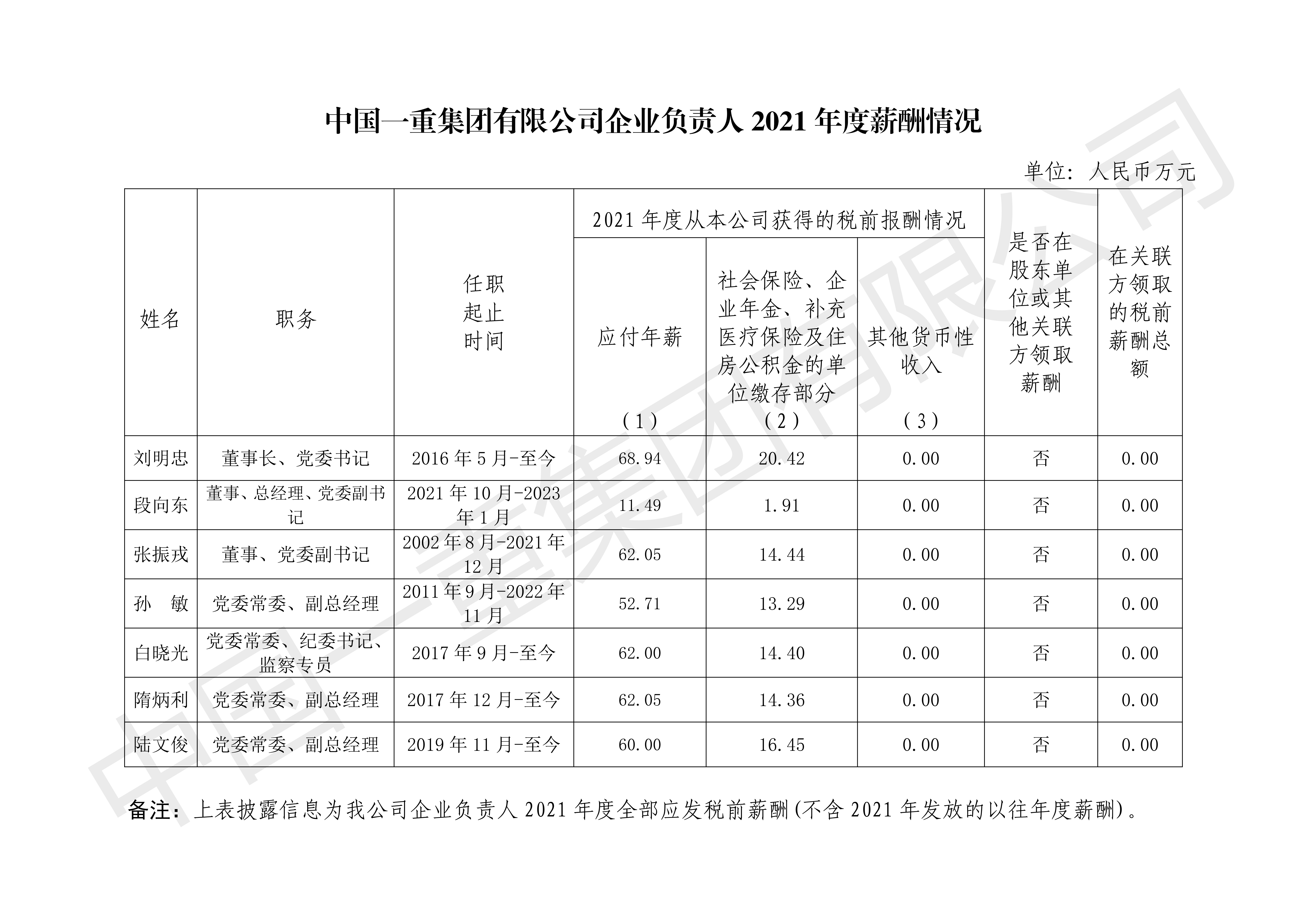 [薪酬公示]中國一重集團有限公司企業(yè)負責(zé)人2021年度薪酬情況
